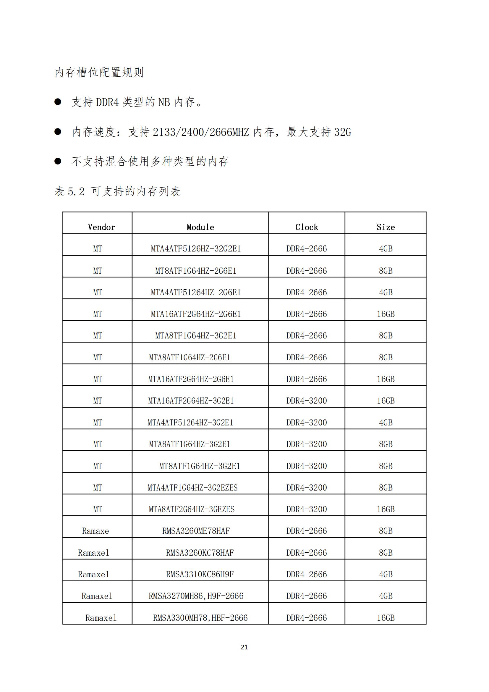 · 最大支持 2 条 DDR4 内存,内存支持 SODIMM,内存速率可支持到 2666MHz, 可支持最多提供 32G 内存容量。
