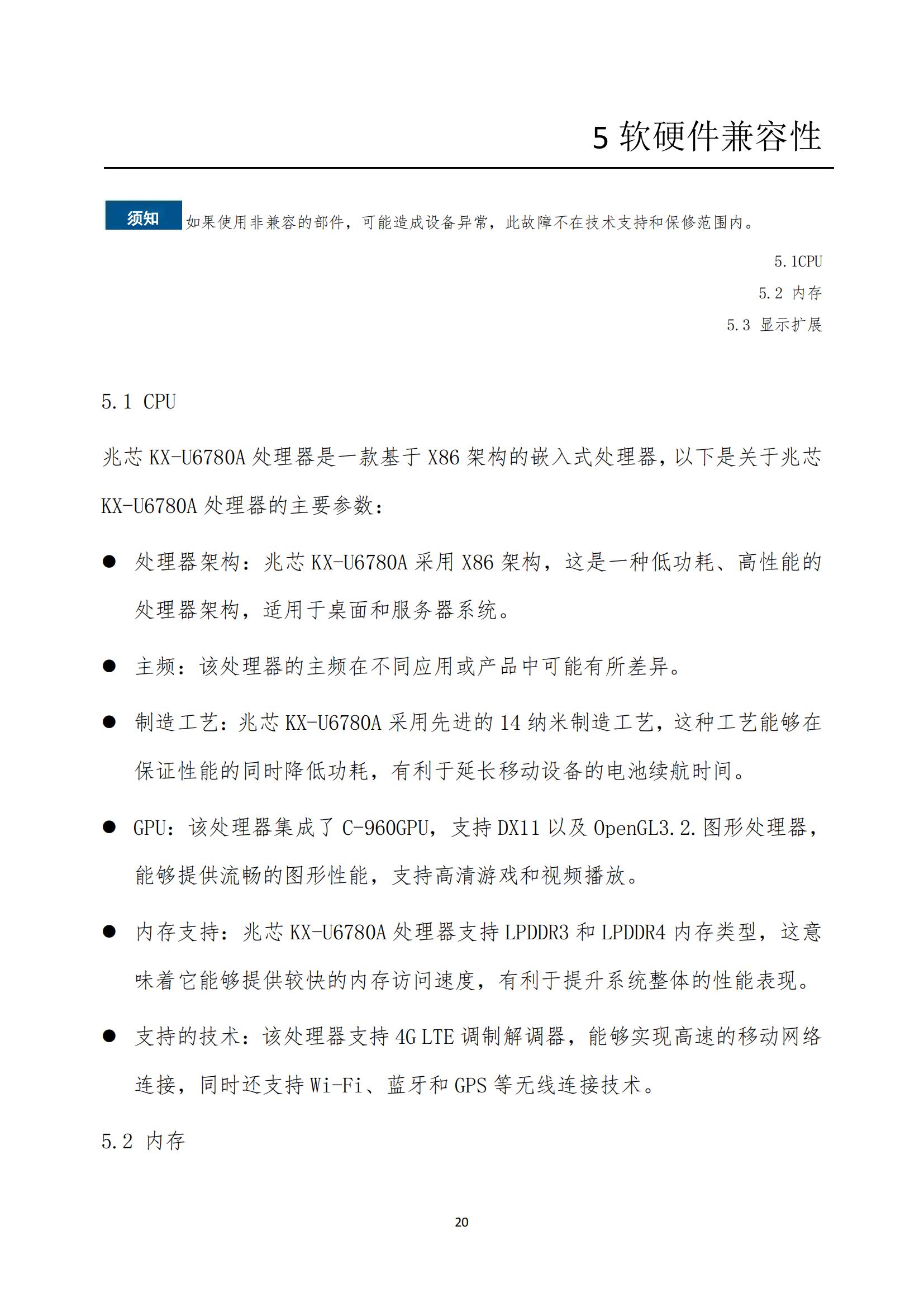 · 支持国产兆芯 KX6000 16NM 全系列板贴 CPU,内部集成了 DDR4、PCIe、 Mic-In、Line-Out、Line-SPK、USB 等接口,集成 ZX C960 DX11 超核心 显卡、集成高保真 USB 音频芯片,具备看门狗功能。
